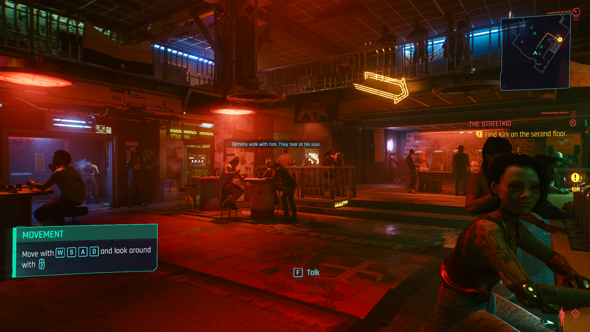 Soon after that, you engage in your first conversation with the bar tender that wants a favor. And so your journey begins and I know I need to talk to characters to move the story along and I have decisions I can make along the way. As soon as you stand up from the bar, a welcome tutorial dialog pauses the game to give you some perspective on the settings for your selected storyline. In my case, I chose Street Kid so the game starts by welcoming me to Night City. This is the first tutorial dialog I see and it is used to help introduce other game mechanic aspects and hints through the game like combat, street smarts, interacting with police and many other things.