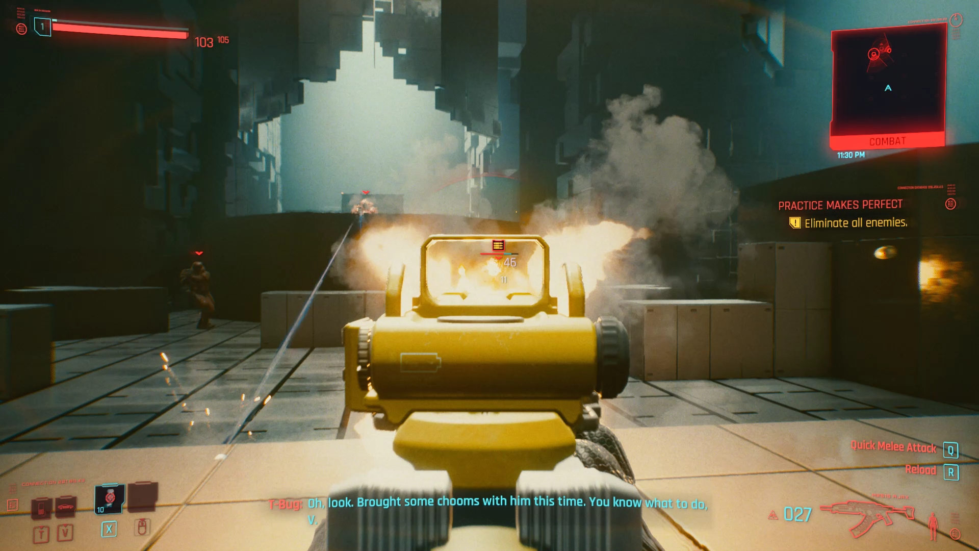 The combat in Cyberpunk 2077 is follows the conventions of most FPS games. You have weapons you can equip, aim down sights and you need to manage your spatial awareness to gain a tactical advantage on enemies in the field. You can crouch to avoid getting shot and reference you mini-map to zero in on enemies. More on weapon types later. At this point of the journey the tutorial is focusing on introducing gun play to the player and starts to build on more tactical awareness in subsequent tutorials about Hacking, Melee and Stealth.